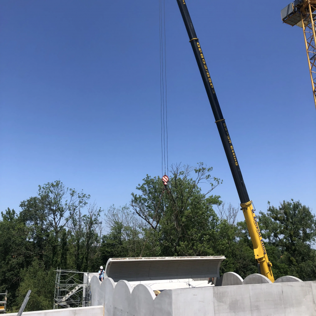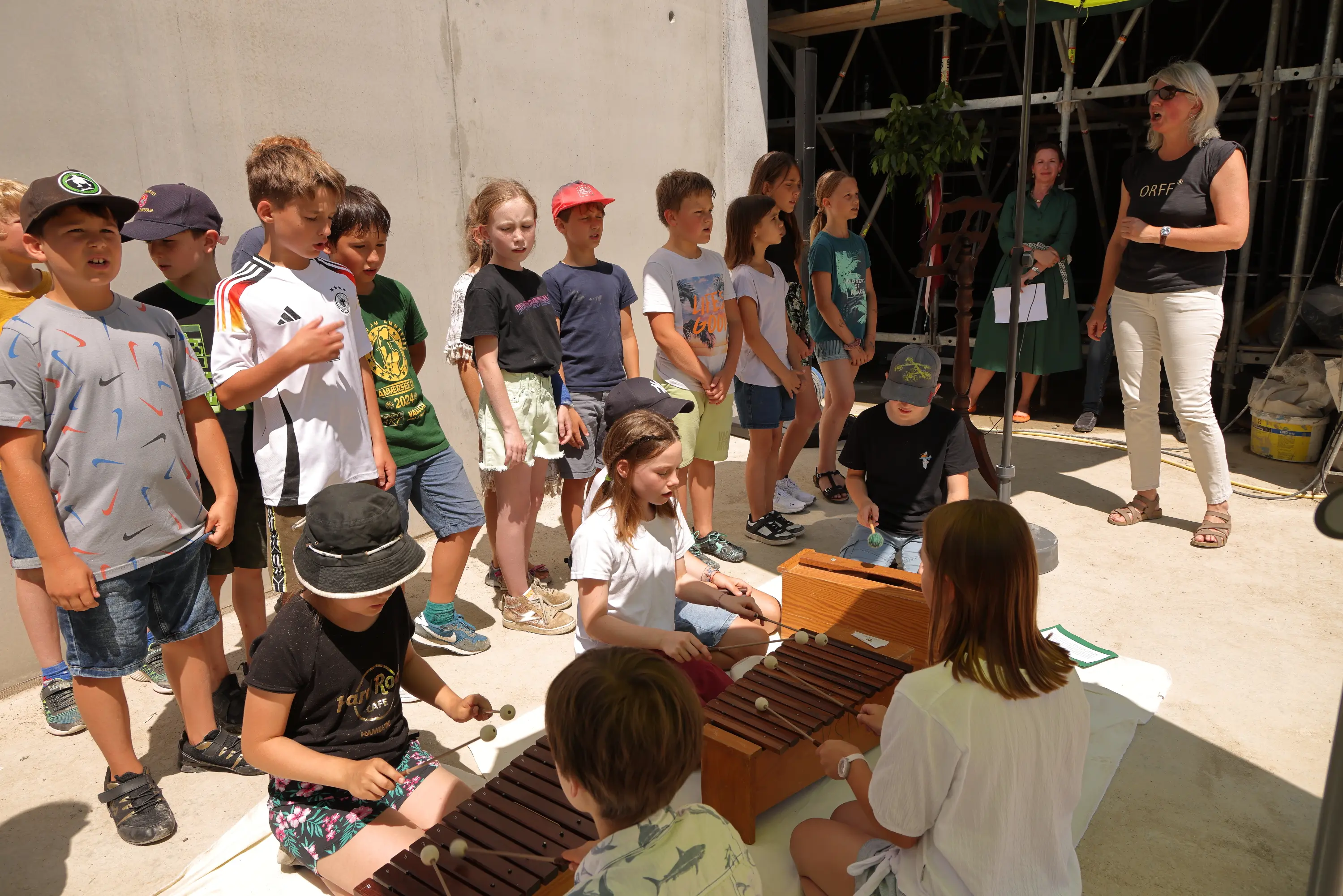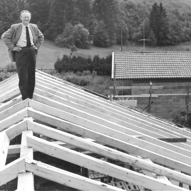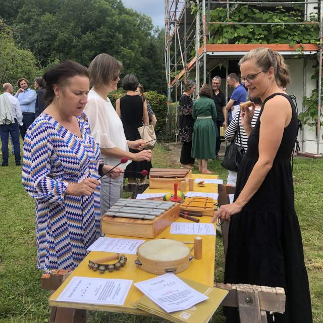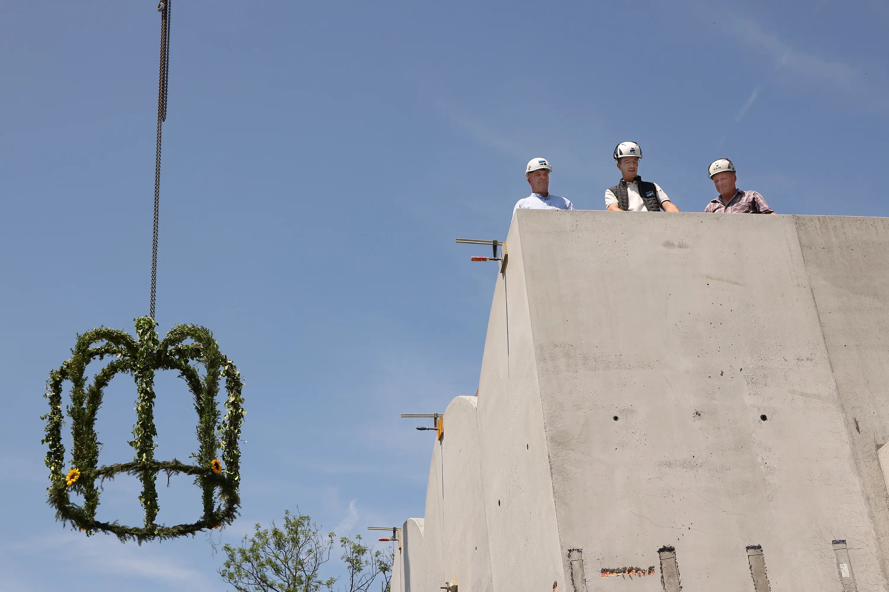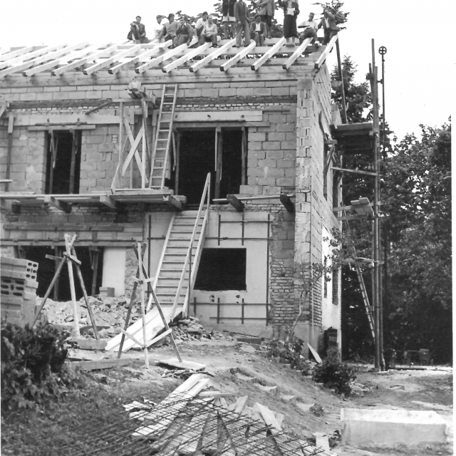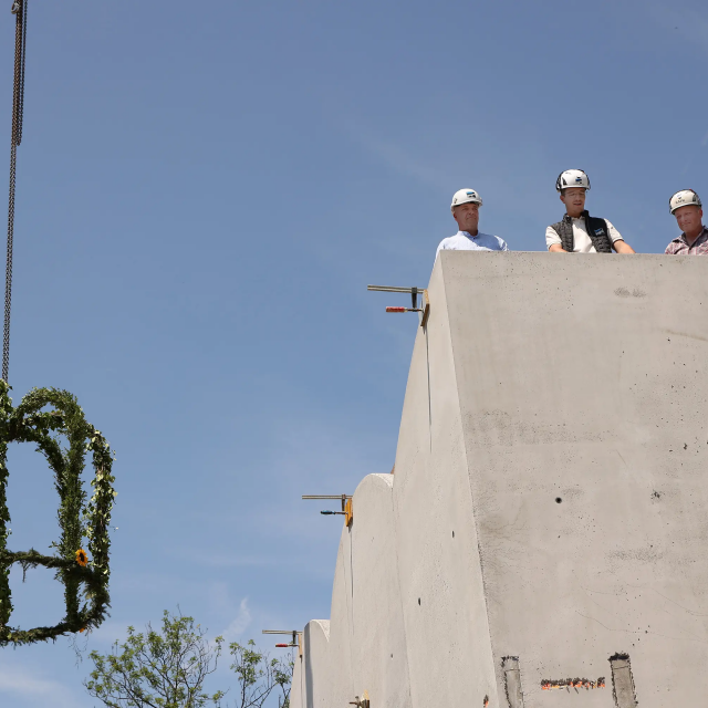 A roof for its birthday. The Carl Orff Foundation celebrates 10 July 2024 with a topping-out ceremony. In June, the time had finally come: the new building of the COMU Carl Orff Museum at Ziegelstadel 1 in Dießen got a new roof. Construction workers used two cranes to lift 11 tonnes of vaulted ceiling onto the large exhibition hall. Almost 70 years after Carl Orff himself celebrated the extension of his house at Ziegelstadel 1, another topping-out ceremony took place. Pupils from the Carl Orff School in Dießen opened the celebration with songs. Secretary General Judith Janowski then welcomed those present and expressed her particular thanks to all the sponsors who have generously supported the museum. Last but not least, site manager Torsten Huhle from the contractor Lutzenberger, foreman Christoph Meyer and concrete expert Lukas Schröther gave the topping-out speech and emptied their glasses three times to the applause of the guests: ‘May the museum be a place of knowledge, wonder and inspiration, where history comes alive and knowledge flourishes.’ Following the ceremony, celebrations took place in the courtyard of the Orff estate. Guests were able to enjoy food and drink. At an improvised table with instruments and playing cards, they had the opportunity to test a hands-on station of the future museum for the first time and sing a birthday song to Carl Orff. Fotos: Michael Tschuschner und COMU | COS Richtfest 1955 Bauarbeiter stehen auf dem Dachstuhl, am Giebel ist ein geschmücktes Bäumchen © COS Carl Orff auf dem Dachstuhl Carl Orff steht im Anzug auf dem Dachstuhl seines Hauses. © COS Das Museum bekommt ein Tonnendach Mit dem Kran wird ein Tonnenteil in ein modernes Gebäude eingesetzt. © COS Der erste Schritt fürs Dach ist gemacht! Alle Betonteile sind verbaut Ein modernes Betongebäude mit mehreren halbmondförmigen Kuppeln am Giebel. © COS Die Richtkrone An einem Baukran hängt eine große grünumwundene Krone. © COS Kinder singen ein Ständchen zum Richtfest Kinder singen und spielen auf Xylosphonen. © Foto: Michael Tschuschner Die Bauleute sprechen den Richtspruch Über den Rand eines Betongebäudes im Rohbau ragen drei Köpfe mit Helmen. © Foto: Michael Tschuschner Buffet fürs Richtfest Auf einem Buffet stehen Platten mit Essen und Blumendeko und Tellerstapel. © COS Ein Geburtstagsständchen für Carl Orff Frauen stehen an einem Tisch mit vielen Instrumenten und machen Musik. © COS Artikel in News • 19. Jul 2024 Teilen Twitter Facebook LinkedIn